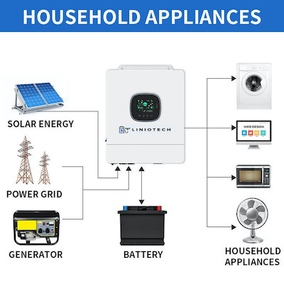 5000W Off-Grid Power Inverter Charger Support Utility / Generator / Solar Charge. It has Four charging modes optional, i.e. PV priority, Utility Priority, Hybrid Charging, and Only Solar Charging; and Two output modes: mains bypass and inverter output; uninterrupted power supply, to meet different application requirements.
